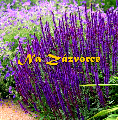 Šalvěj hajní ´Caradonna´ (Salvia nemorosa ´Caradonna´). Dlouhé klasy květů modrofialové barvy až 50 cm vysoké, stonky jsou temně fialové. Vykvétá již koncem května a postupně kvete až do konce léta.